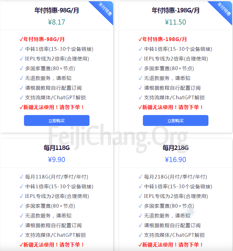 [飞兔云]年付98元98G流量 中转1倍率 多国家覆盖