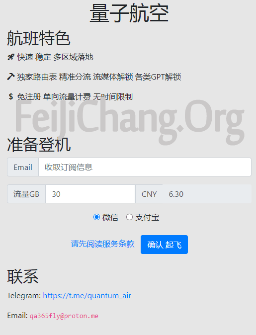 [量子航空]6.3元30G流量 免注册 单向流量计费 无时间限制